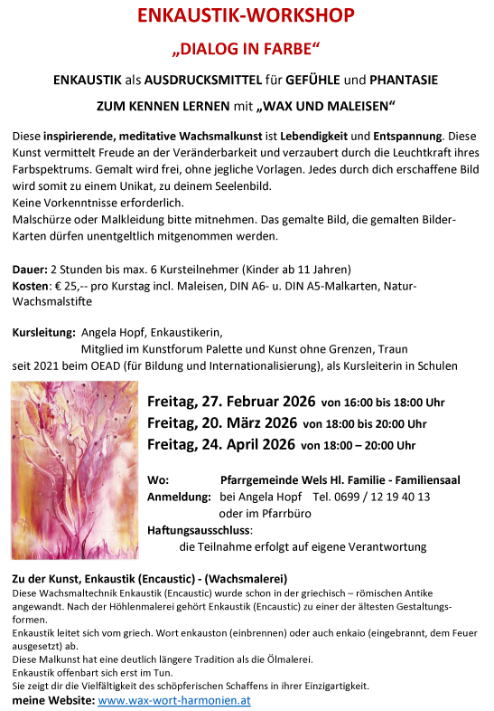 Enkaustik-Workshop Wann 27. Februar 2026 16:00 - 18:00 Zum Kalender hinzufügen ICS herunterladen Google Kalender iCalendar Office 365 Outlook Live Enkaustik Workshop Hopf Angela – Plakat zum Herunterladen